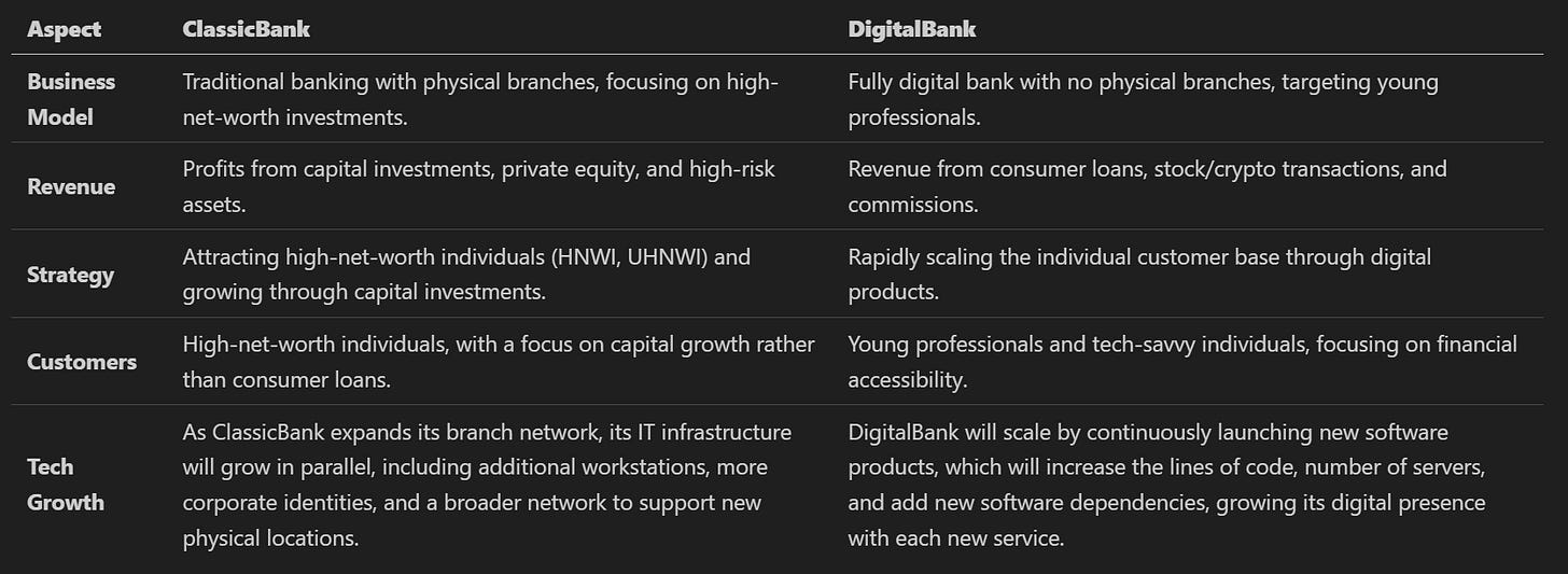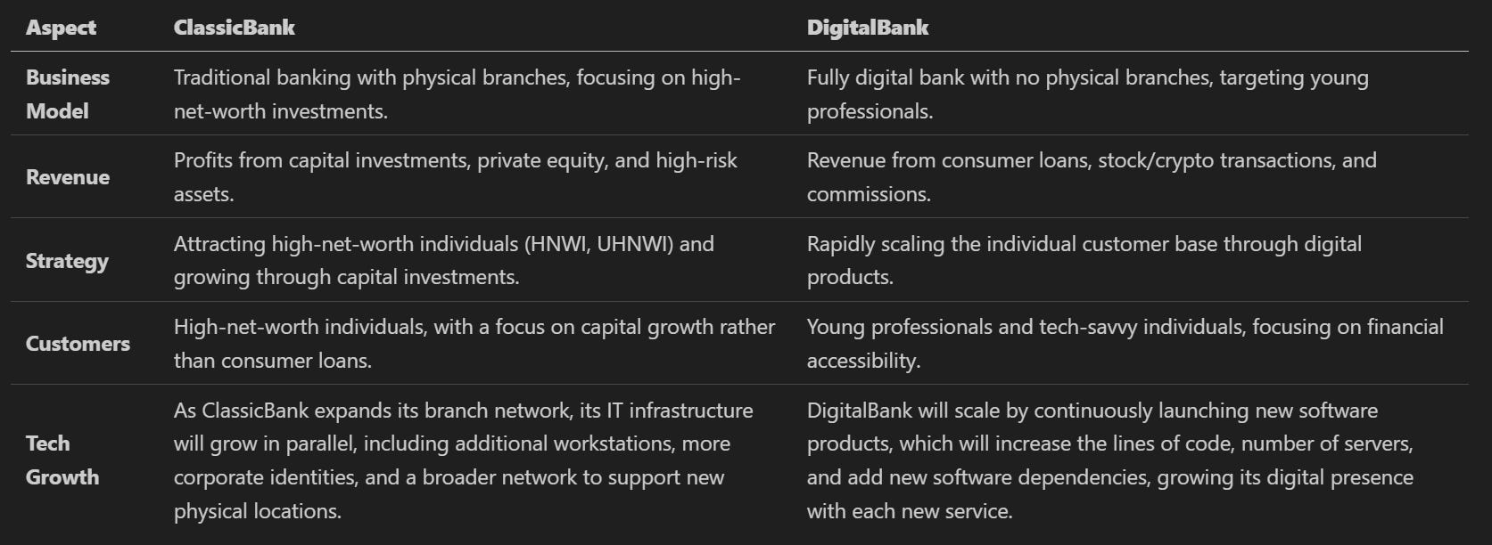 ClassicBank is a traditional bank with physical branches, offering standard banking services. It then uses the capital from its customers to make direct investments and private equity deals. Unlike typical banks that earn from fees or interest, ClassicBank profits from the returns on these investments. So, its growth strategy is all about attracting high-net-worth individuals (HNWI and UHNWI) to raise capital, and then using that capital to make better, more profitable investments. This means ClassicBank’s customer base won’t grow quickly or through consumer loans. It’s about finding a few high-value clients and expanding through capital investments. As a result, ClassicBank isn’t likely to focus on developing digital products. Its IT infrastructure will expand in line with its physical branch network, and its due diligence operations will be intensive because of the high-risk nature of its investments.