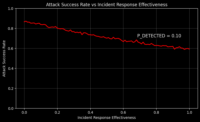 After running the simulation, we plot the results as shown below. As you can see, increasing incident response effectiveness reduces the attacker’s success rate from around 87% down to roughly 60%.