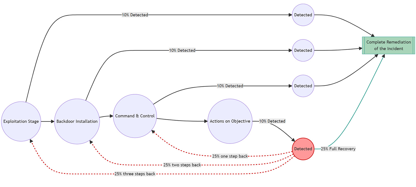 The full attack chain would look like the diagram below. After each detected step, there is an X% chance of complete remediation; otherwise the process randomly returns to one of the previous steps.