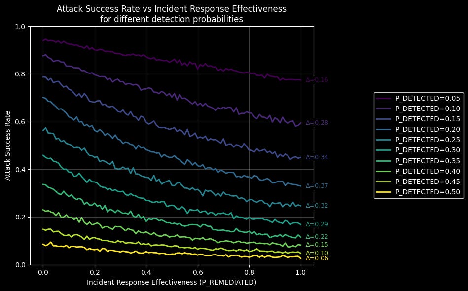 A particularly interesting takeaway is that incident response effectiveness has relatively little impact on attack success at very low or very high detection rates (Δ = 0.16 and Δ = 0.06, respectively). In other words, incident response effectiveness becomes most critical when detection coverage is partial. This was a result I didn’t expect to see at the start of the analysis.
