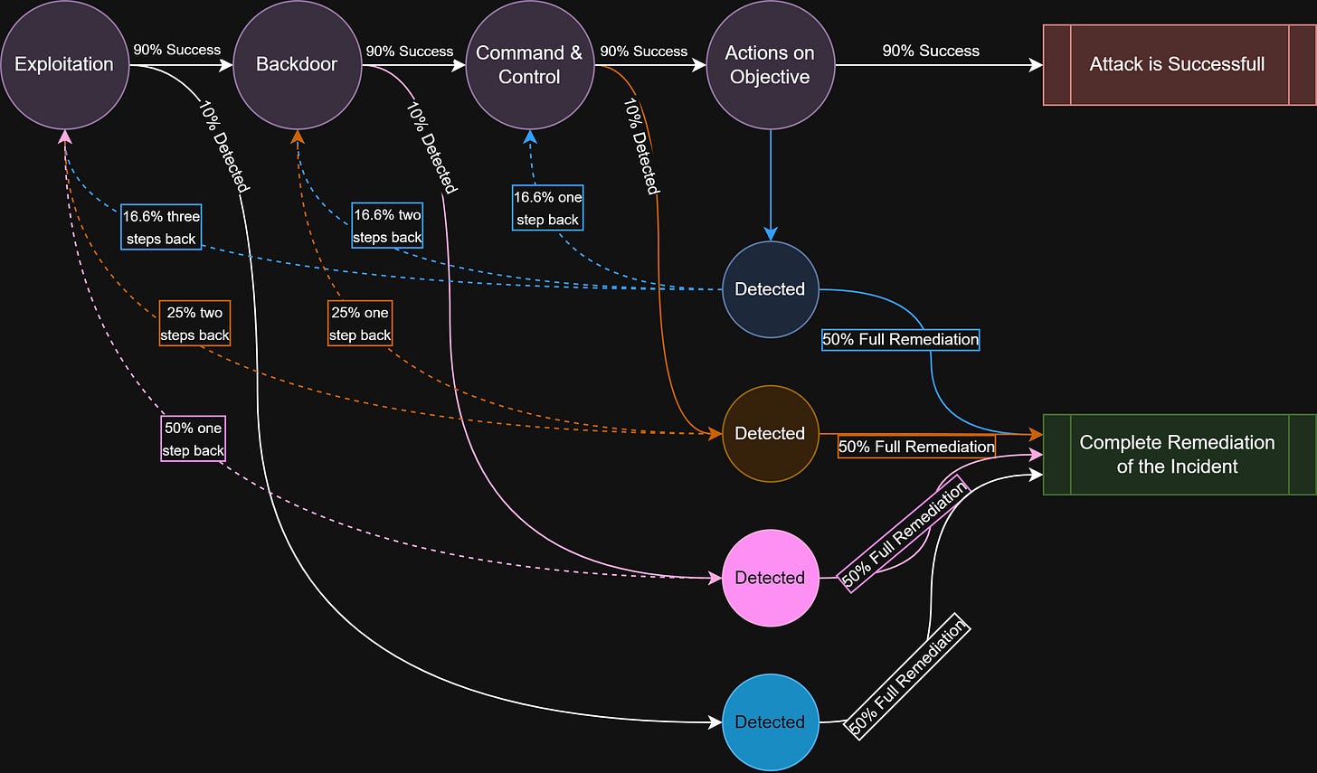 This structure lets the simulation capture the dynamics of a real intrusion where detection may push the attacker back rather than eliminate them outright.