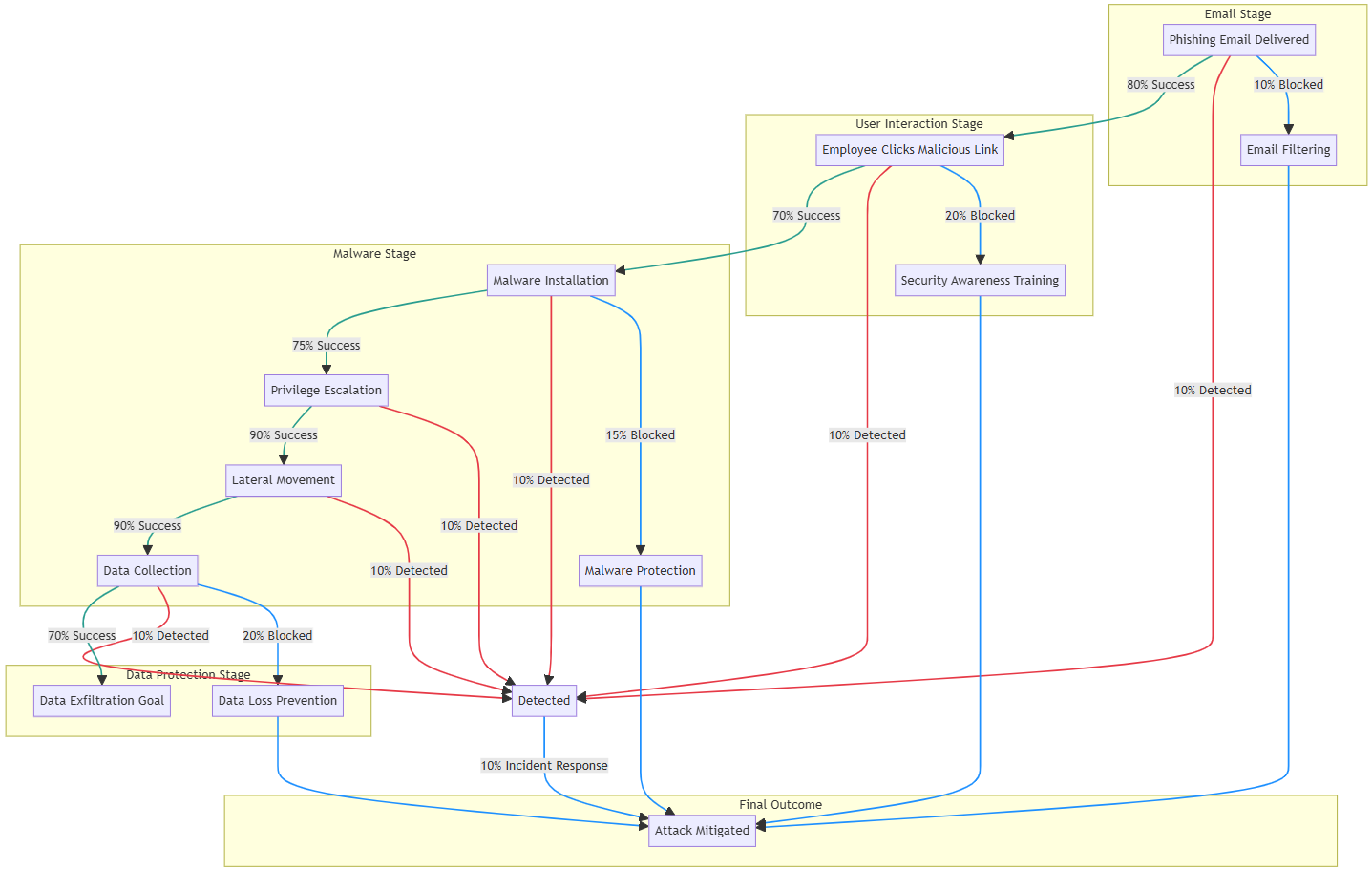By measuring the false negative and true positive rates of each layer, we can calculate the probabilities of success. For example, phishing emails reported by employees would be considered false negatives for our email filtering control.